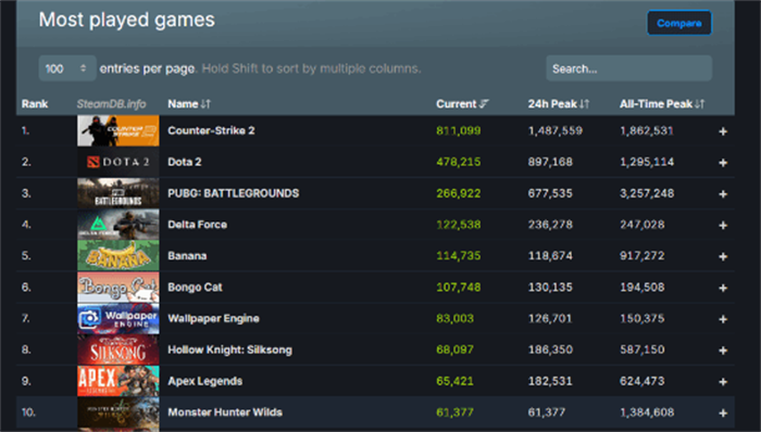 在本次更新上线后,《怪物猎人:荒野》的在线人数现已突破了6万人。根据SteamDB数据显示,本作已重回Steam在线人数榜前10!