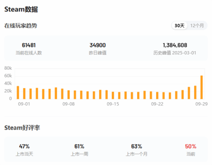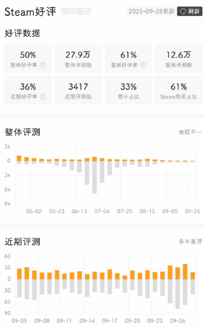 此外,本作的总好评率为50%、简中好评率为19%、最近一个月的好评率好评率为35%。今日截至写稿前新增的112条评价中,好评率为32%,差评率为68%。