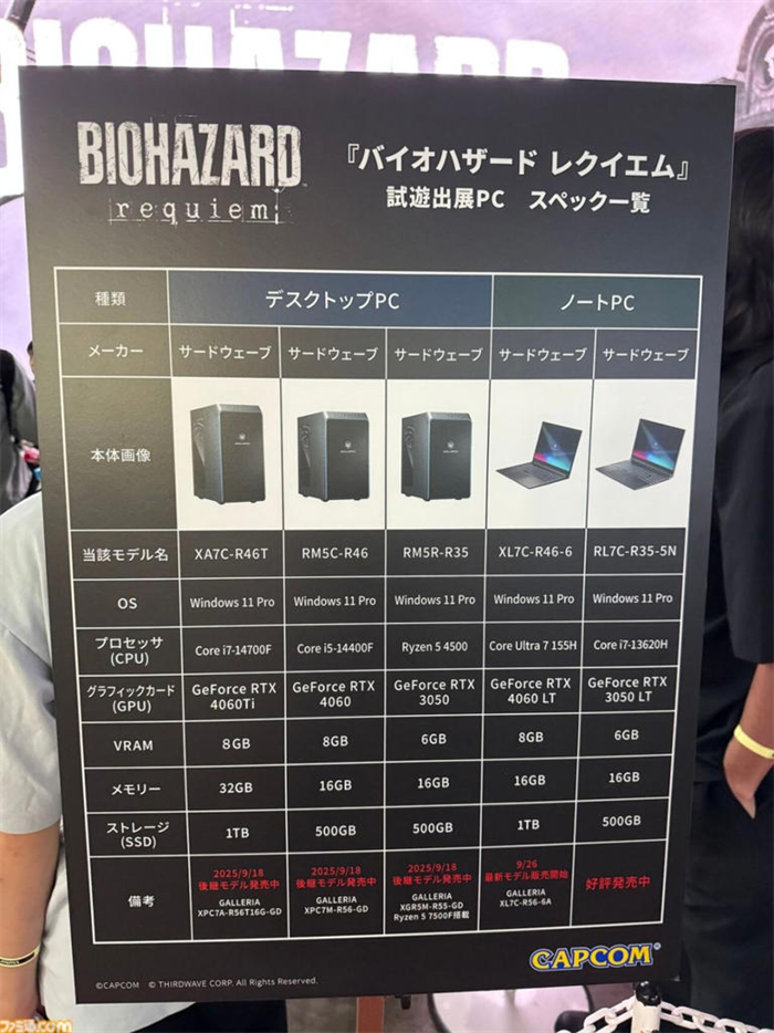 据展台入口附近的展示板显示,《生化危机9》试玩PC规格是: CPU为Intel Core i7-14700F、i5-14400F、Ryzen 5 4500、Core Ultra 7 155H、Core i7-13620H,均为Core i5或Ryzen 5以上。显卡为RTX 4060Ti、RTX 4060、RTX 3050、RTX 4060LT、RTX 3050LT,整体覆盖RTX 3050~4060级别。显存为6GB至8GB。内存为16GB至32GB。