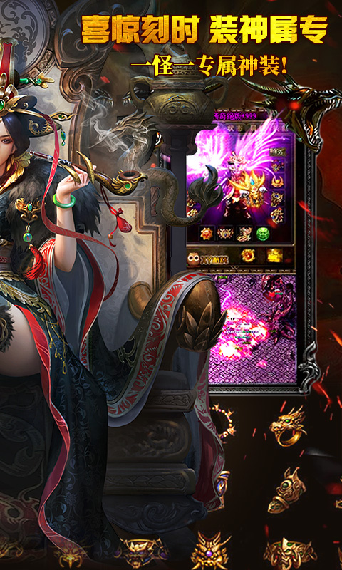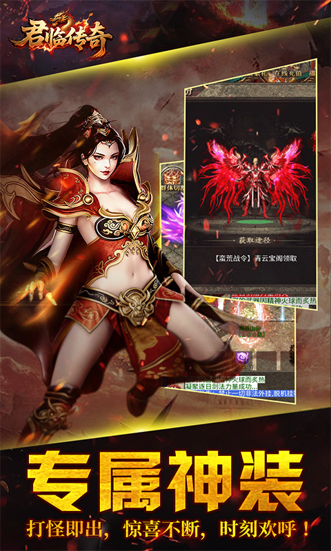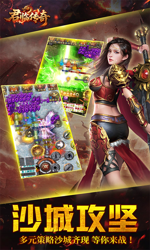 “【超强打击 刀刀切割】真实打击,刀刀切割,小怪满屏不用抢! 【专属神装 时刻惊喜】一怪一专属神装,打怪即出,惊喜不断,时刻欢呼! 【超变玩法 装备靠打】稀有装备打怪掉落,更有专属神器装备,等你获取! 【沙城攻坚 策略对决】肉盾堵门,抢占复活点,多元策略沙城齐现,等你来战!”