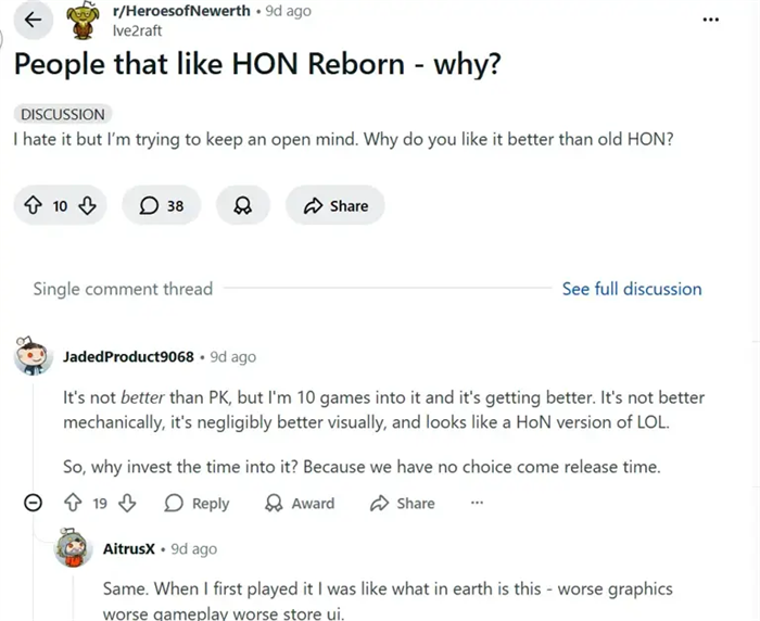 游戏仍在封闭测试中,粉丝似乎对重制并不感冒,Reddit论坛的HoN分区充斥着各种负面反馈,有的反应冷淡,有的悲痛欲绝。大家普遍认为重制版并没有在机制和画面上更胜一筹,玩起来更像HoN版的《英雄联盟》。